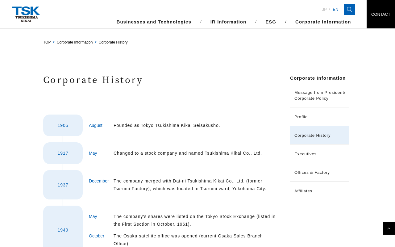 Corporate History|Corporate Information|Tsukishima Holdings Co., Ltd. Corporate History Corporate Information 1905 Founded as Tokyo Tsukishima Kikai Seisakusho. 1917 Changed to a stock company and named T...(もっと見る)