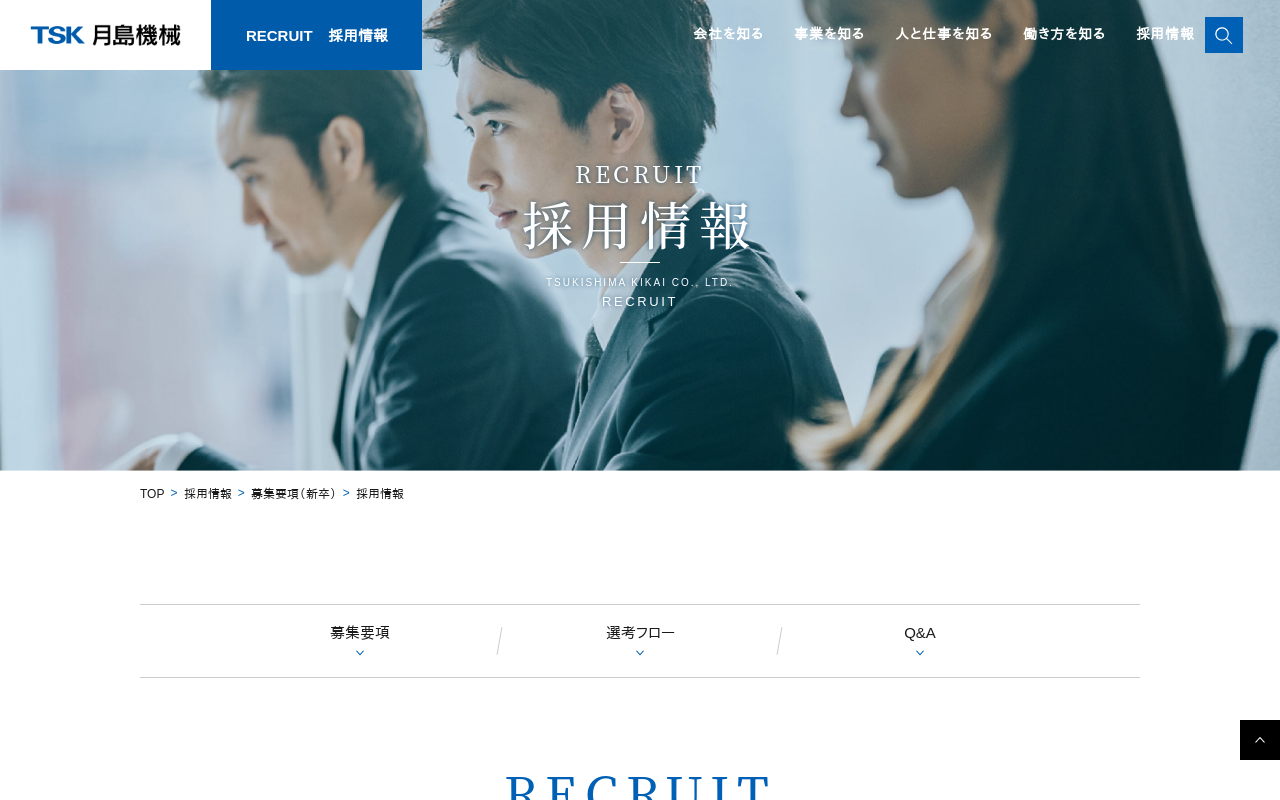 採用情報(募集要項/選考フロー/Q&A) | 月島ホールディングス株式会社 RECRUIT 採用情報 採用情報 RECRUIT FLOW Q&A 採用・専攻について 配属・人事制度について 日常業務・仕事について RECRUIT RECRUIT TSUKISHIMA HOLDINGS CO., LTD. 募集要項 募集学科 事務系: 全学部・全学科 技術系: 機械、化学、電気、電子、制御、環境、衛生、土木...(もっと見る)