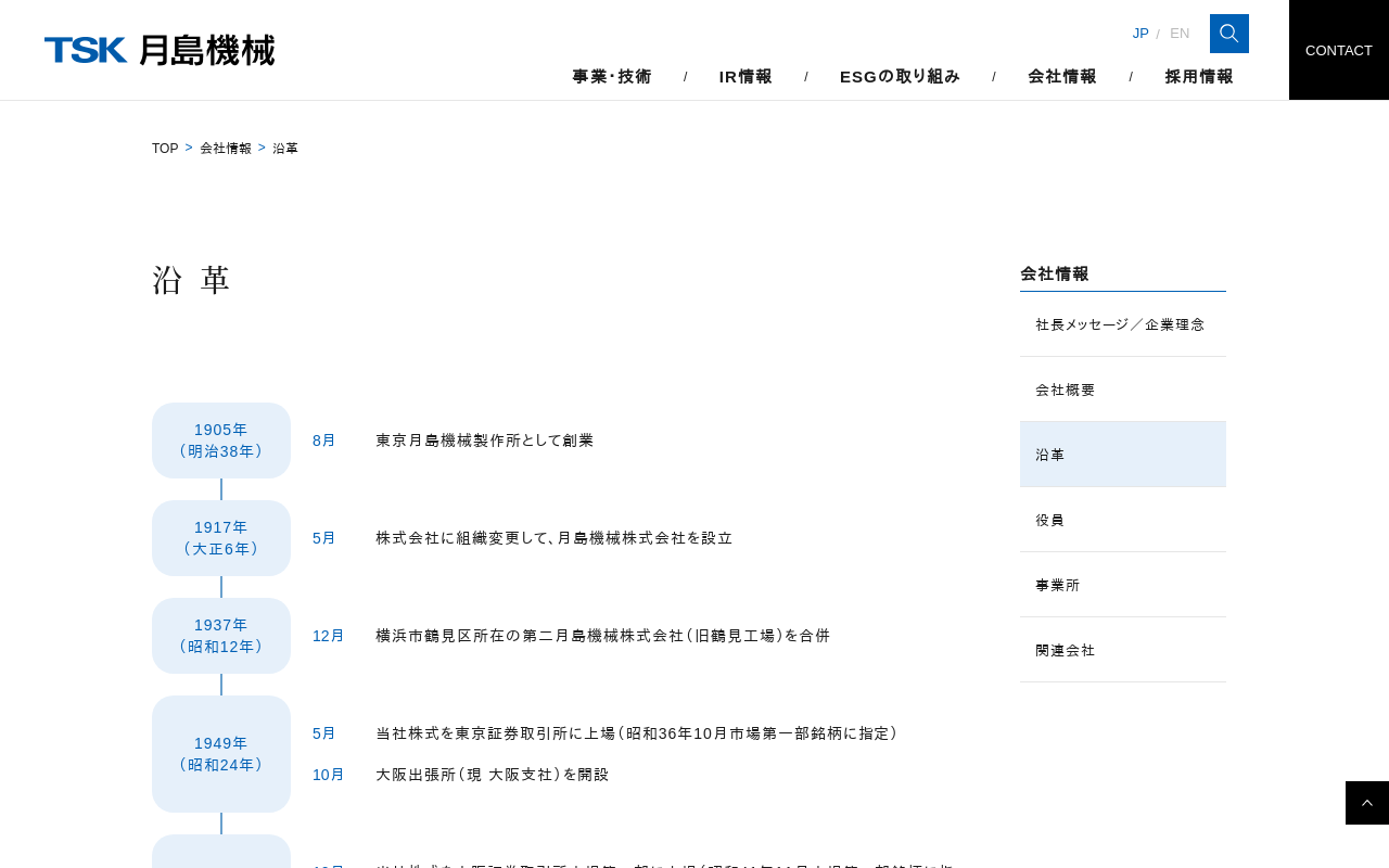 沿革|月島ホールディングス株式会社 沿 革 会社情報 1905年 (明治38年) 東京月島機械製作所として創業 1917年 (大正6年) 株式会社に組織変更して、月島機械株式会社を設立 1937年 (昭和12年) 横浜市鶴見区所在の第二月島機械株式会社(旧鶴見工場)を合併 1949年 (昭和24年) 当社株式を東京証券取引所に上場(昭和36年10月市場第一部銘柄に指定) 大阪出張所(現 大阪支社)...(もっと見る)