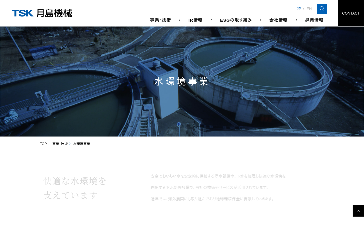 月島JFEアクアソリューション|TJAS 月島JFEアクアソリューション株式会社(TJAS) 水環境で活躍する月島JFEアクアソリューション製品 グループ会社 ニュースリリース 水環境の循環型社会 浄水場フロー 下水処理場フロー PRODUCTS ライフサイクルビジネス 浄水処理設備 排水処理設備 着水井 前処理・沈殿設備 浄水池 濃縮槽 脱水設備 乾燥設備 ろ過・薬品注入設備 水処理設備 汚泥処理設備 ...(もっと見る)