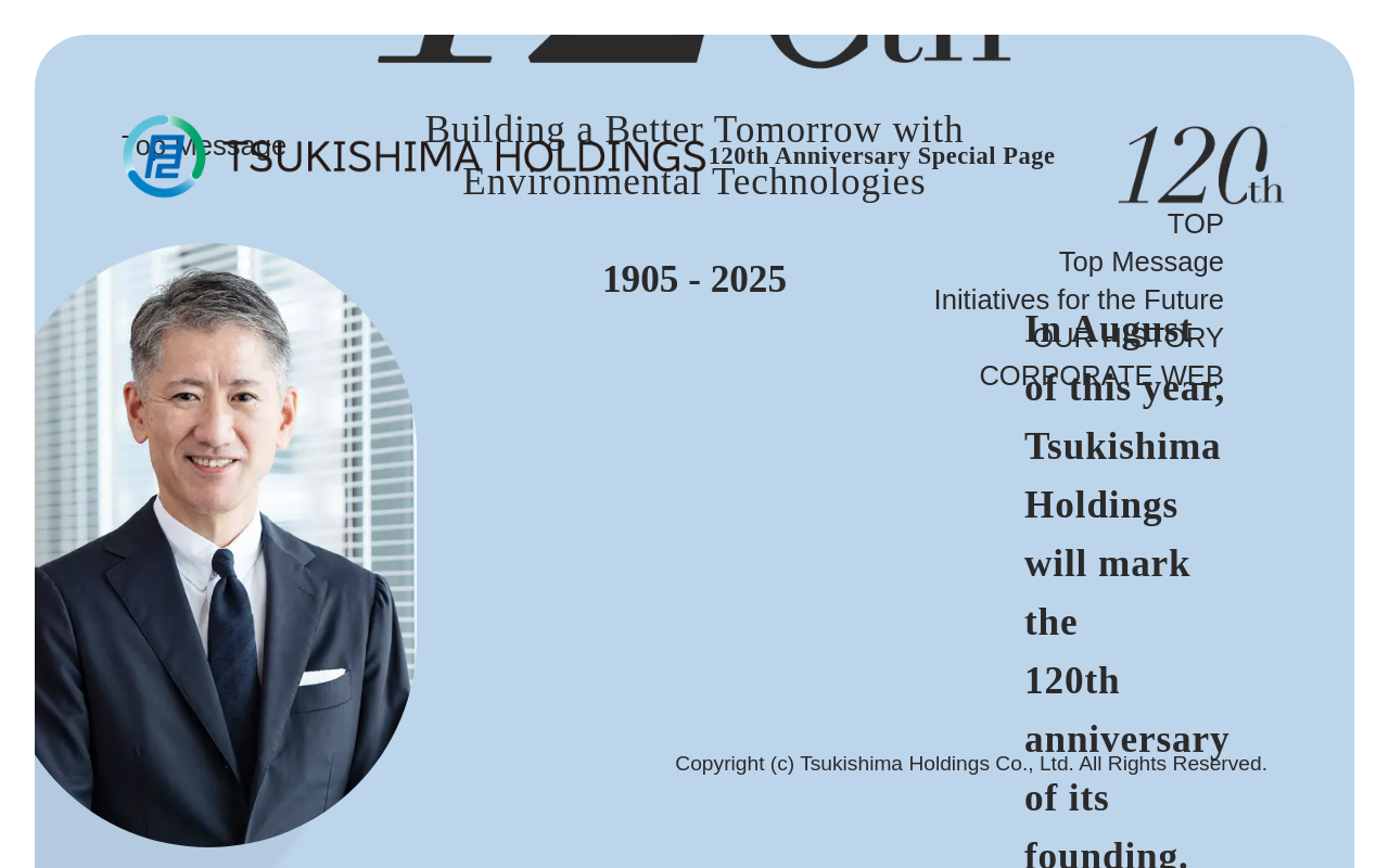 120th Anniversary Special Page | Tsukishima Holdings 120th August 1, 2025 Tsukishima Holdings celebrates its120th anniversary We have been and will continue to support affluent and comfortable lifestyles....(もっと見る)