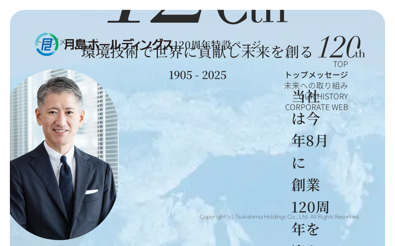 120周年特設ページ|月島ホールディングス株式会社 120th 2025年8月1日月島ホールディングスは創業120周年を迎えました これまでも、これからも、豊かで快適な暮らしを支えてまいります 未来のために、環境とともに歩みサステナブルな社会を支える事業活動 環境技術で世界に貢献し未来を創る 創業 事業拡大 環境分野への進出 新たなる領域へ 創業 事業拡大 環境分野への進出 新たなる領域へ これまでも、こ...(もっと見る)