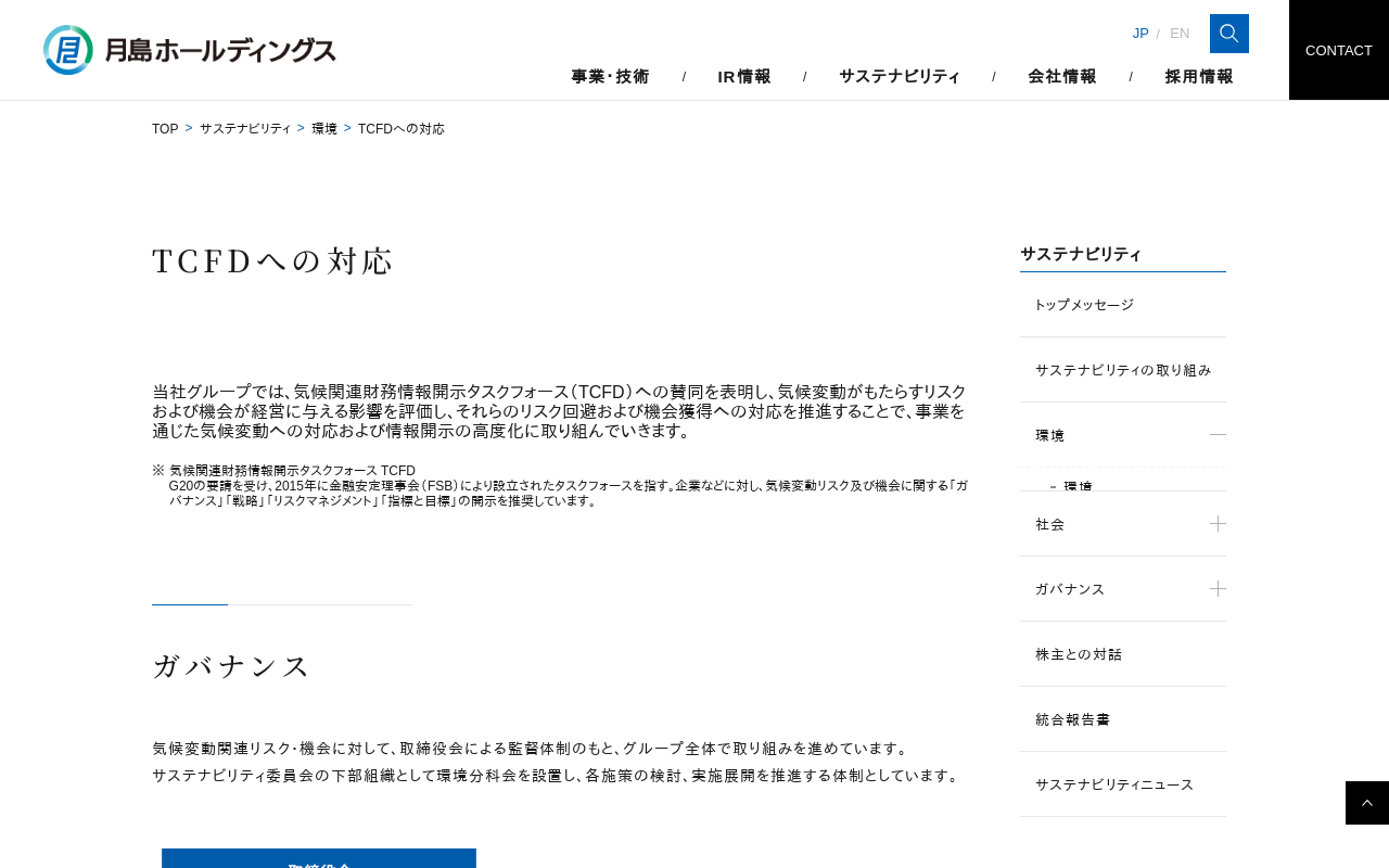 TCFDへの対応 | 環境 | サステナビリティ | 月島ホールディングス株式会社 TCFDへの対応 ガバナンス 戦略 リスク管理 指標と目標 リスク・機会一覧 サステナビリティ 当社グループでは、気候関連財務情報開示タスクフォース(TCFD)への賛同を表明し、気候変動がもたらすリスクおよび機会が経営に与える影響を評価し、それらのリスク回避および機会獲得への対応を推進することで、事業を通じた気候変動への対...(もっと見る)