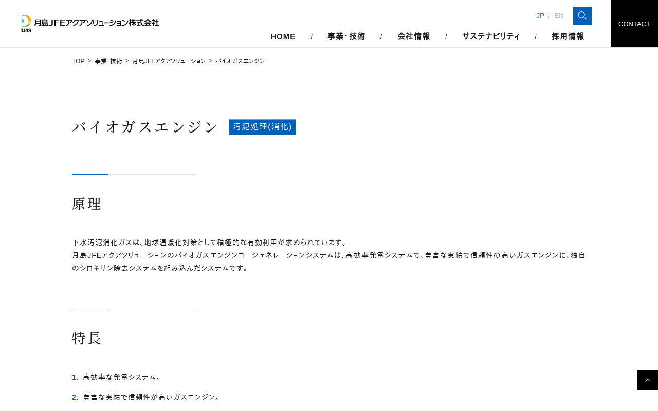 バイオガスエンジン|水環境事業|月島ホールディングス株式会社 バイオガスエンジン 原理 特長 関連分野/設備・技術 月島JFEアクアソリューション (機器・プラント)について 上水処理設備 下水処理設備 汚泥再生 下水汚泥消化ガスは、地球温暖化対策として積極的な有効利用が求められています。 月島JFEアクアソリューションのバイオガスエンジンコージェネレーションシステムは、高効率発電システムで、豊...(もっと見る)