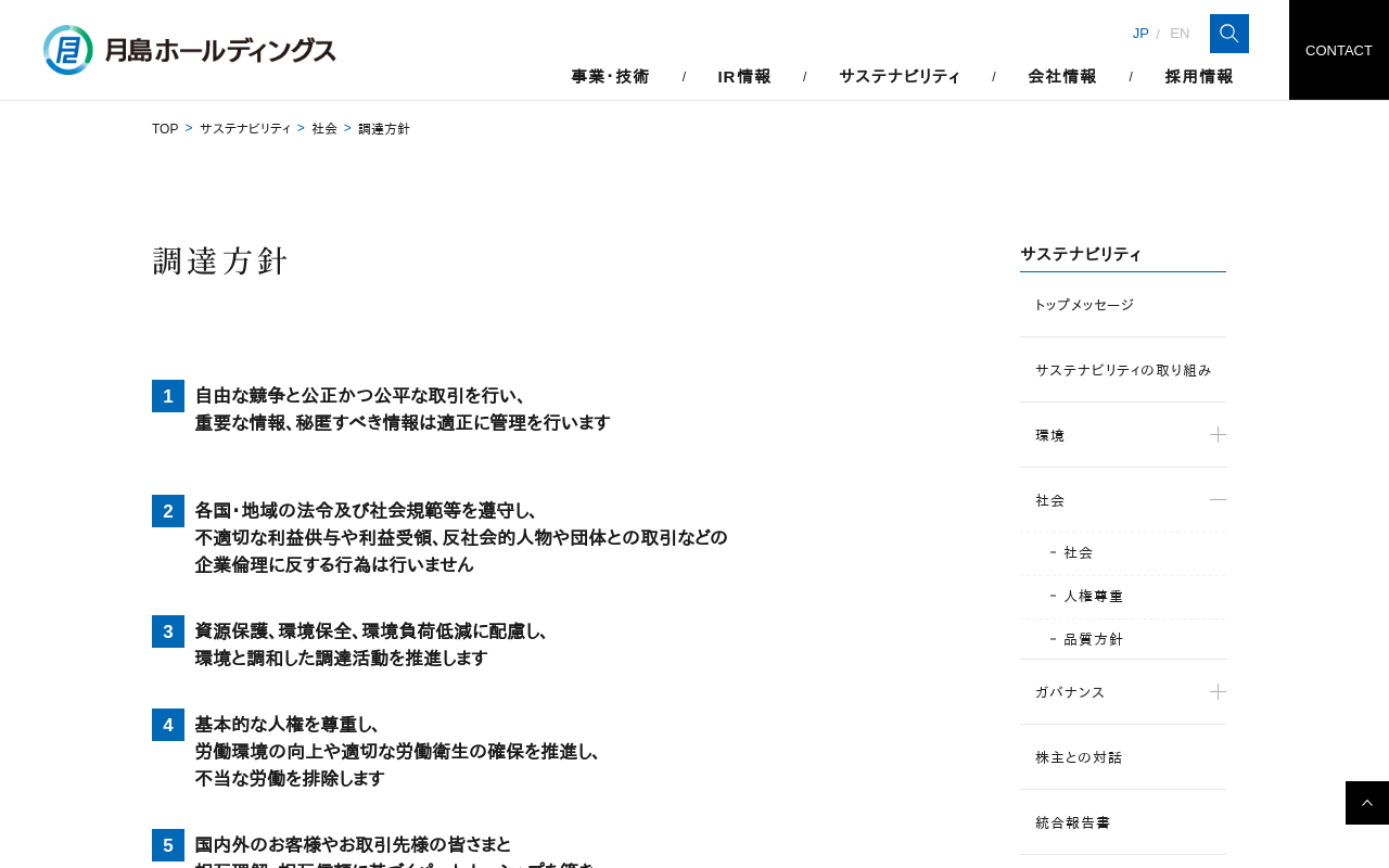 調達方針 | 社会 | サステナビリティ | 月島ホールディングス株式会社 調達方針 サステナビリティ 1 自由な競争と公正かつ公平な取引を行い、重要な情報、秘匿すべき情報は適正に管理を行います 2 各国・地域の法令及び社会規範等を遵守し、不適切な利益供与や利益受領、反社会的人物や団体との取引などの企業倫理に反する行為は行いません 3 資源保護、環境保全、環境負荷低減に配慮し、環境と調和した調達活動を推進...(もっと見る)