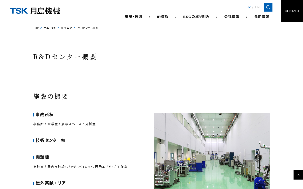 R&Dセンター概要|月島ホールディングス株式会社 R&Dセンター概要 R&Dセンターツアー 施設の概要 R&D CENTER TOUR 事務所棟 技術センター棟 実験棟 屋外実験エリア 排水処理設備 事務所 / 会議室 / 展示スペース / 分析室 実験室 / 屋内実験場(バッチ、パイロット、展示エリア) / 工作室 処理水量 20m3 /日 最新の技術が生み出されるR&Dセンターの紹介です。 解析・シミ...(もっと見る)