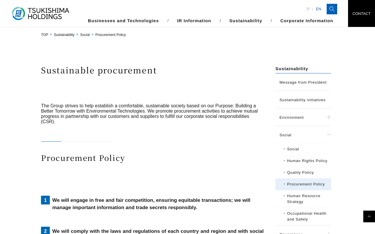 Procurement Policy | Social|Sustainability|Tsukishima Holdings Co., Ltd. Sustainable procurement Procurement Policy Sustainability The Group strives to help establish a comfortable, sustainable society ba...(もっと見る)