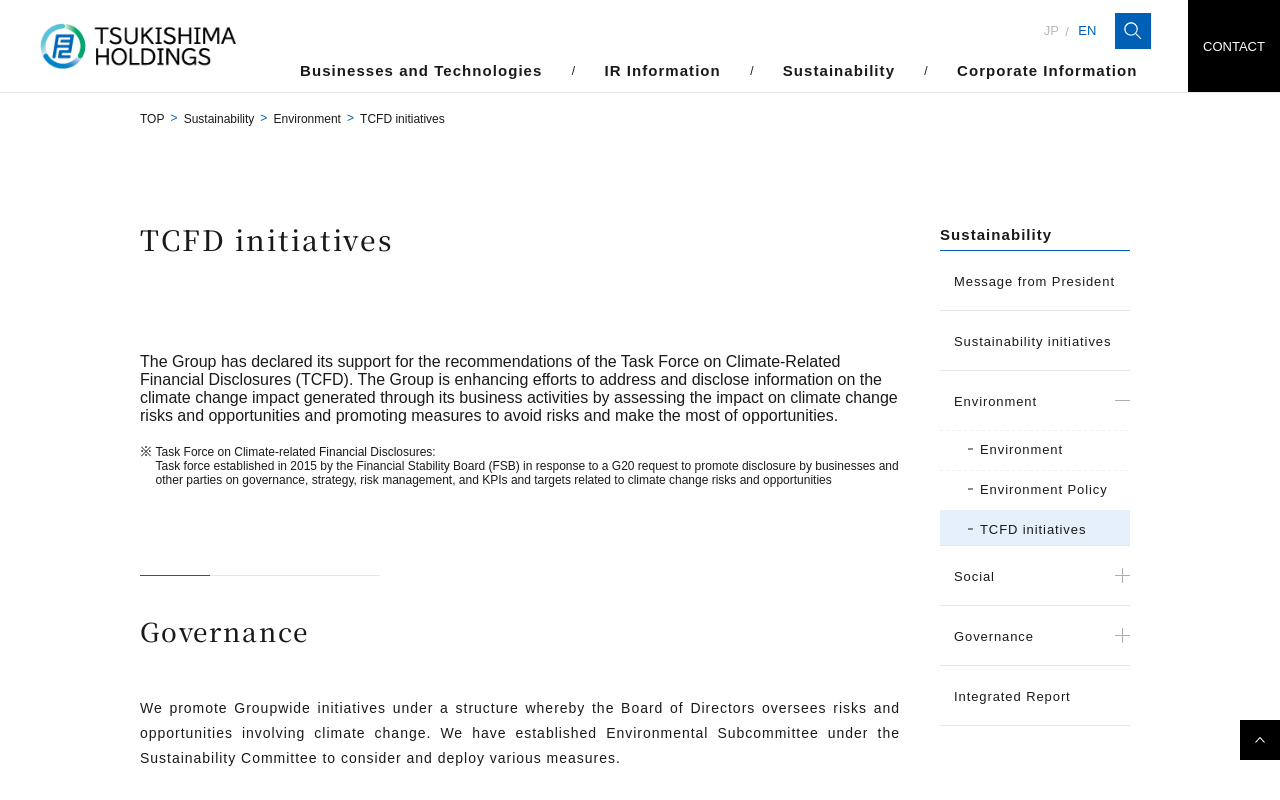 TCFD initiatives | Environment | Sustainability|Tsukishima Holdings Co., Ltd. TCFD initiatives Governance Strategy Risk management Key Performance Indicator(KPI) and targets Risks and opportunities Sustai...(もっと見る)