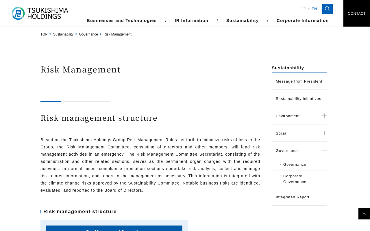 Risk Management | Governance | Sustainability | Tsukishima Holdings Co., Ltd. Risk Management Risk management structure Major business risks and responses Sustainability Risk management structure Based on...(もっと見る)