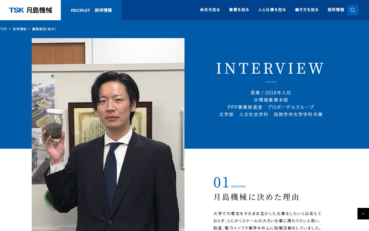 インタビュー | 人と仕事を知る | 新卒採用 | 採用情報 | 月島ホールディングス株式会社 INTERVIEW 月島ホールディングスグループに決めた理由 私の仕事 職場の雰囲気 学生のみなさまへ オフショット 月島JFEアクアソリューション 営業 / 2016年入社 文学部 人文社会学科 民族学考古学学科卒業 大学での専攻をそのまま活かした仕事をしたいとは考えておらず、とにかくスケール...(もっと見る)