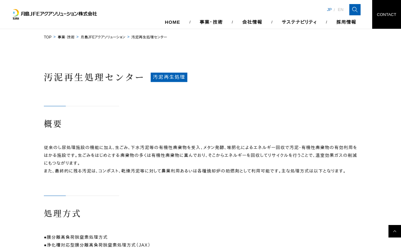 汚泥再生処理センター|水環境事業|月島ホールディングス株式会社 汚泥再生処理センター 概要 処理方式 実績例 月島JFEアクアソリューション (機器・プラント)について 上水処理設備 下水処理設備 汚泥再生 従来のし尿処理施設の機能に加え、生ごみ、下水汚泥等の有機性廃棄物を受入、メタン発酵、堆肥化によるエネルギー回収で汚泥・有機性廃棄物の有効利用をはかる施設です。生ごみをはじめとする廃棄物の多く...(もっと見る)