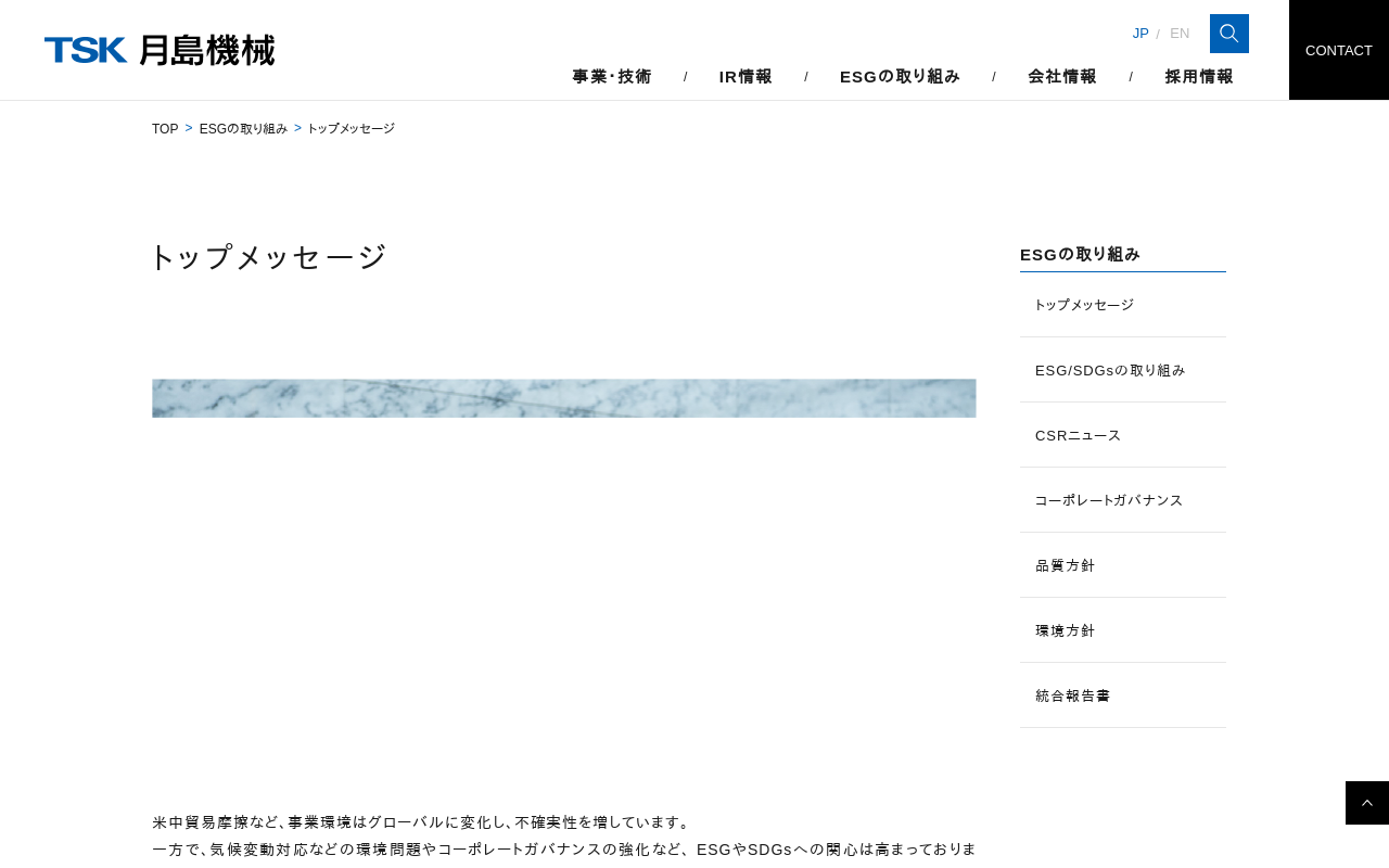 トップメッセージ|月島ホールディングス株式会社 トップメッセージ 事業を通じた社会課題の解決に取り組み、サステナビリティの推進と持続可能な社会の実現に貢献します サステナビリティ 当社グループは、「環境技術で世界に貢献し未来を創る」というパーパスに基づき、快適な水環境を提供する上下水道設備や、豊かで快適な暮らしを支える素材をつくる機械・プラントなど、社会・産業インフラ向けの製品やサービスを提供してまいりま...(もっと見る)
