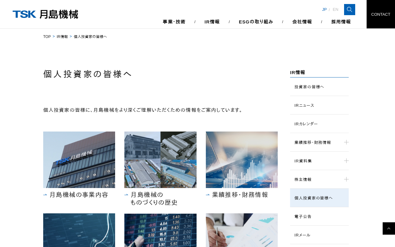 個人投資家の皆様へ|月島ホールディングス株式会社 IR情報 個人投資家の皆様に、月島ホールディングスをより深くご理解いただくための情報をご案内しています。 早わかり月島ホールディングスグループ 会社紹介動画 早わかり月島ホールディングスグループ 会社紹介動画 月島ホールディングスの事業内容 月島機械のものづくりの歴史 業績推移・財務情報 株主還元 株主通信 統合報告書 株主メモ 会社説明資料 経営方針 ...(もっと見る)