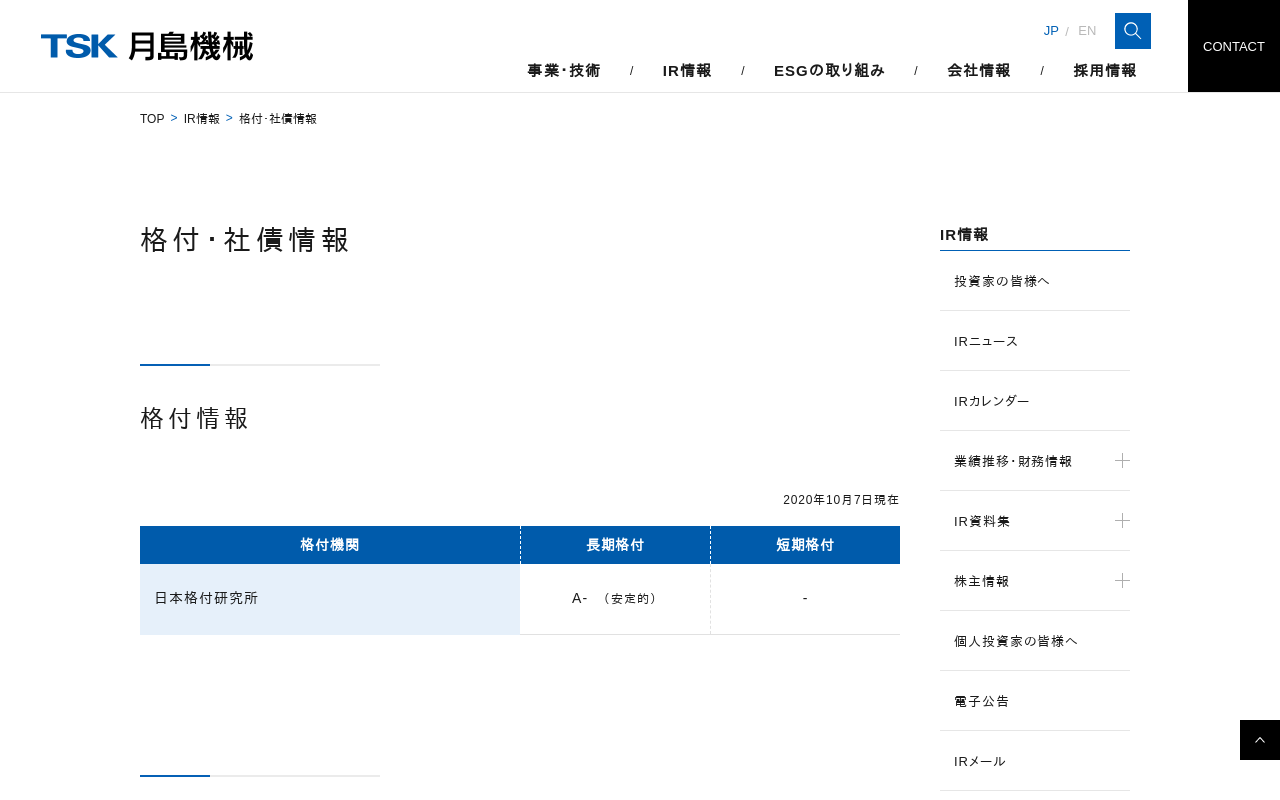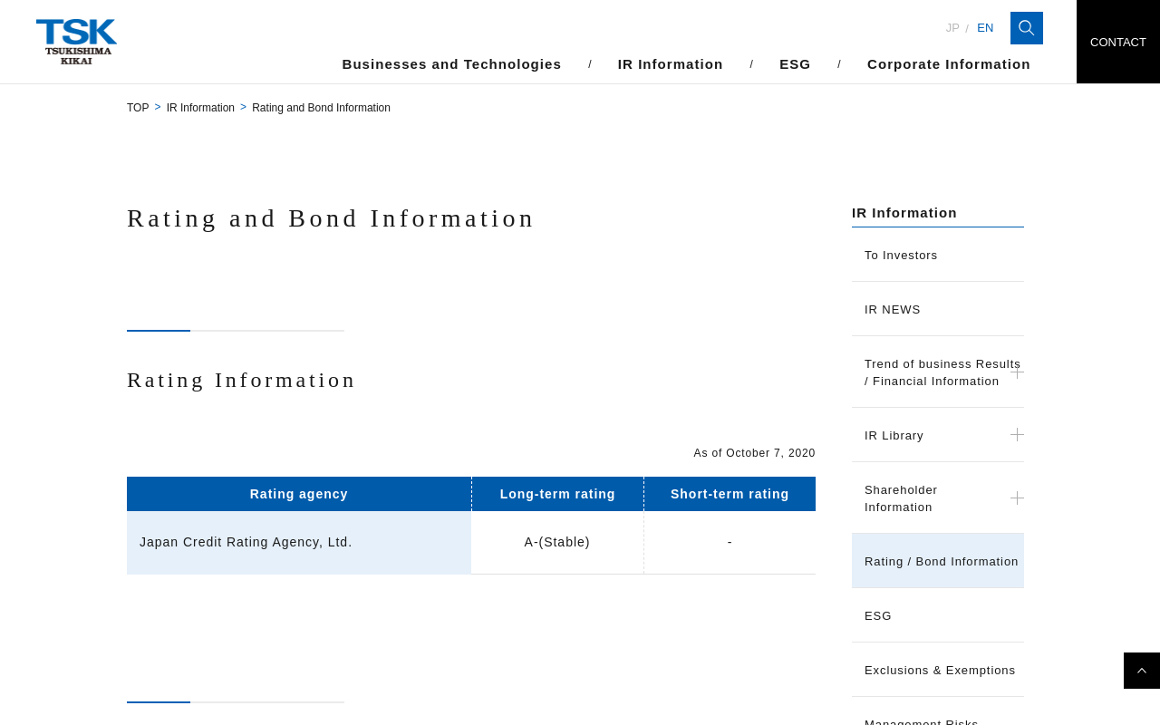 Rating and Bond Information | IR Information | Tsukishima Holdings Co., Ltd. IR Information Management Policy Management Policy To Investors Mediumterm Management Plan Action to Implement Mana...(もっと見る)