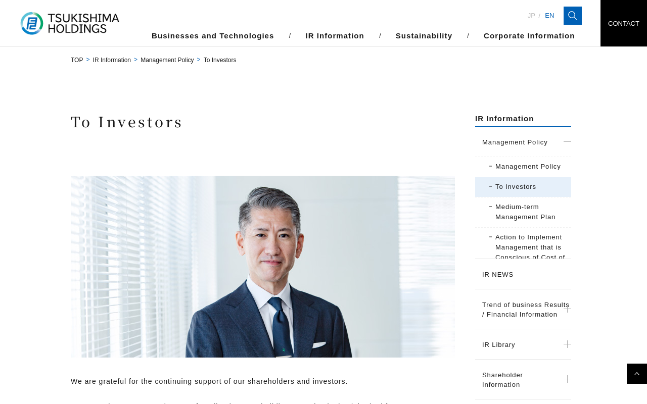 To Investors | Management Policy | IR Information | Tsukishima Holdings Co., Ltd. IR Information We are grateful for the continuing support of our shareholders and investors. For more than a century since...(もっと見る)