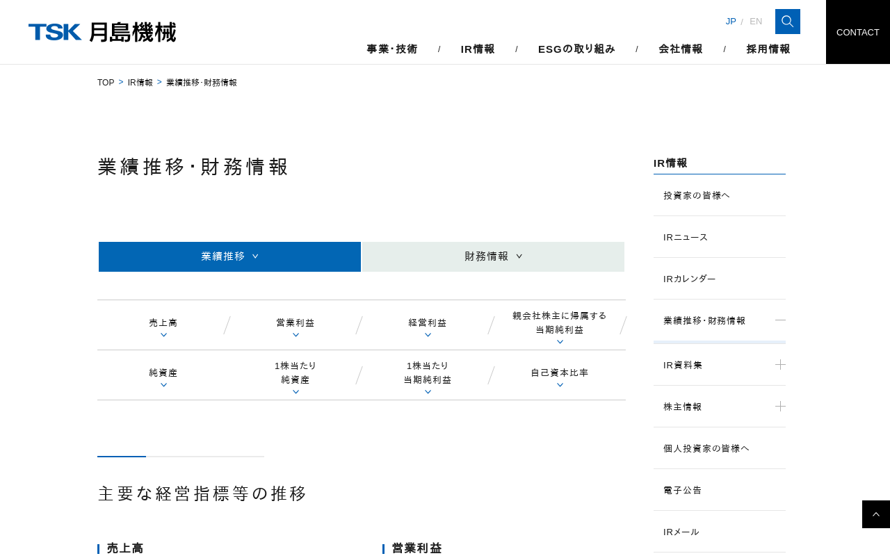 業績推移・財務情報|月島ホールディングス株式会社 IR情報 IRサイトについて 業績推移 財務情報 売上高 営業利益 経営利益 親会社株主に帰属する当期純利益 純資産 1株当たり純資産 1株当たり当期純利益 受注高の推移 売上高の推移 受注残高の推移 財務指標の推移 経営方針 経営方針 投資家の皆様へ 中期経営計画 資本コストや株価を意識した経営の実現に向けた対応 ディスクロー...(もっと見る)
