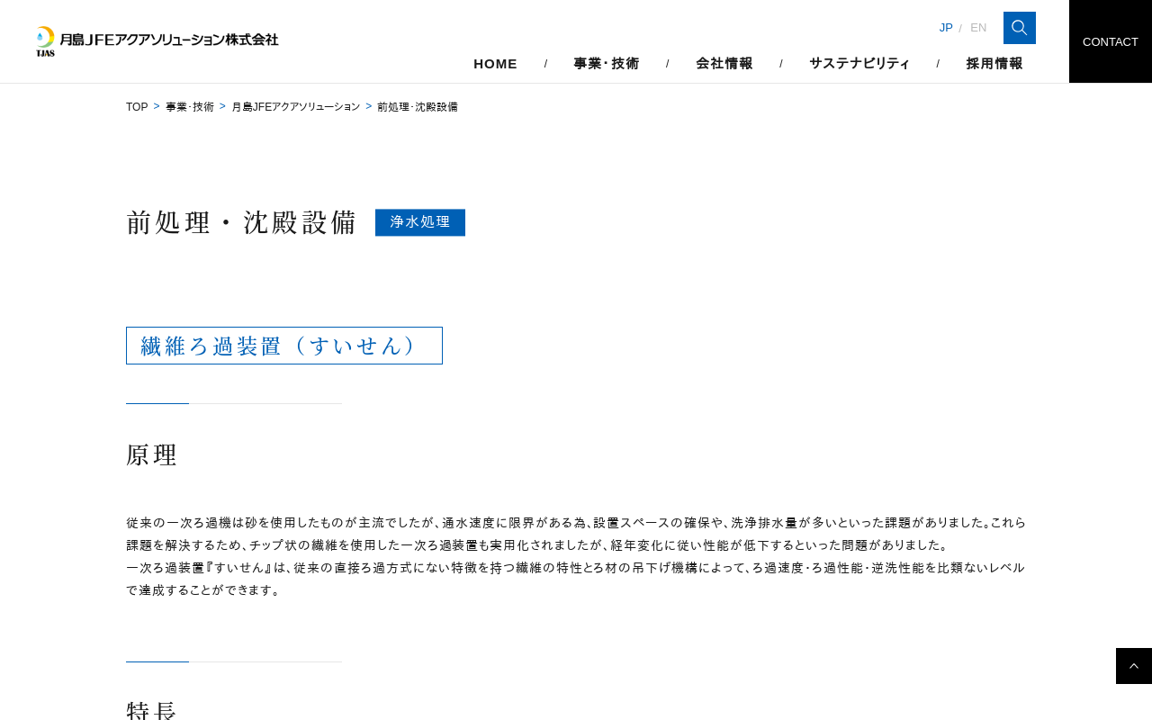 前処理・沈殿設備|水環境事業|月島ホールディングス株式会社 前処理・沈殿設備 原理 特長 原理 特長 原理 特長 原理 特長 関連分野/設備・技術 月島JFEアクアソリューション (機器・プラント)について 繊維ろ過装置(すいせん) 除マンガン用高速繊維ろ過装置(すいせんM) 傾斜管沈降装置 沈殿池掻寄機 (コンパクトブル®) 上水処理設備 下水処理設備 汚泥再生 従来の一次ろ過機は砂を使用した...(もっと見る)