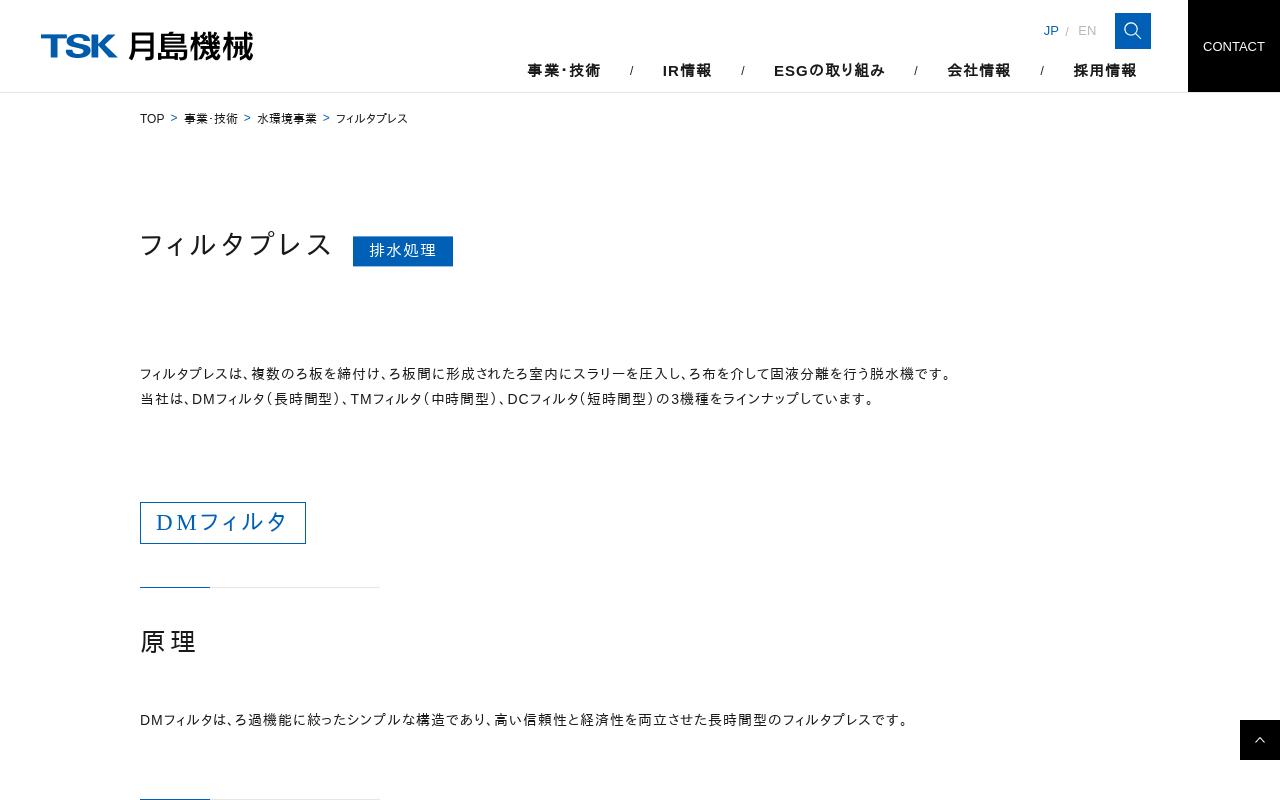 フィルタプレス|水環境事業|月島ホールディングス株式会社 フィルタプレス 原理 特長 原理 特長 原理 特長 関連分野/設備・技術 月島JFEアクアソリューション (機器・プラント)について DMフィルタ TMフィルタ DCフィルタ 上水処理設備 下水処理設備 汚泥再生 フィルタプレスは、複数のろ板を締付け、ろ板間に形成されたろ室内にスラリーを圧入し、ろ布を介して固液分離を行う脱水機です。 当...(もっと見る)