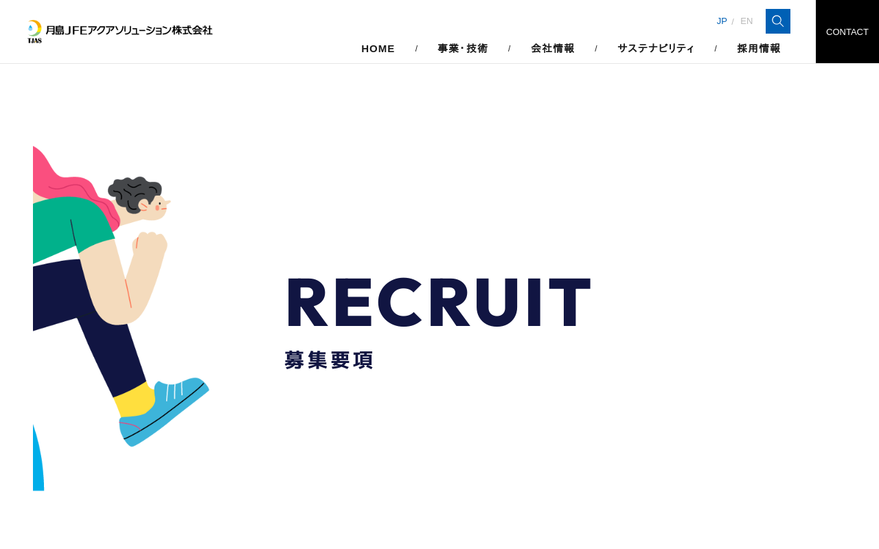 募集要項 | 新卒採用 | 採用情報 | 月島JFEアクアソリューション RECRUIT 募集要項 選考フロー よくあるご質問 採用・専攻について 配属・人事制度について 日常業務・仕事について ENTRY CONTACT 募集要項 事務系:全学部・全学科 技術系:機械、化学、電気、電子、制御、環境、衛生、土木、建築、情報、材料、金属、海洋、農学、生物など 事務系総合職:営業、経理財務、法務、総務、...(もっと見る)