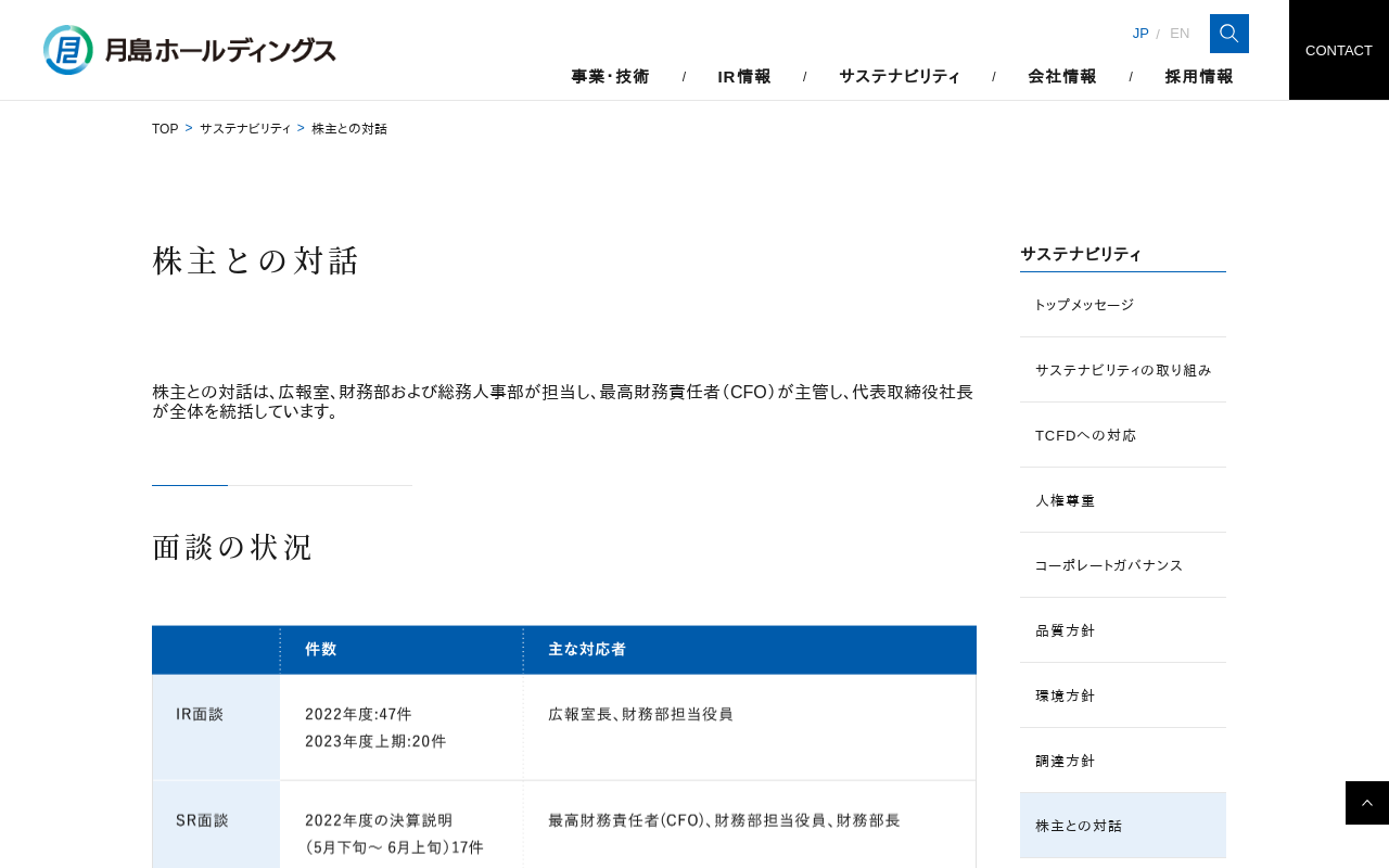 株主との対話|月島ホールディングス株式会社 株主との対話 面談の状況 面談した機関投資家の概要 対話の主なテーマおよび株主の関心事項 対話の成果、取り入れた事項 取締役会へのフィードバック スモールミーティング サステナビリティ 株主との対話は、広報・IR部(旧広報室)、財務部および総務部が担当し、代表取締役副社長最高財務責任者(CFO)が主管し、代表取締役社長が全体を統括しています。 件数 主な対応者 ...(もっと見る)