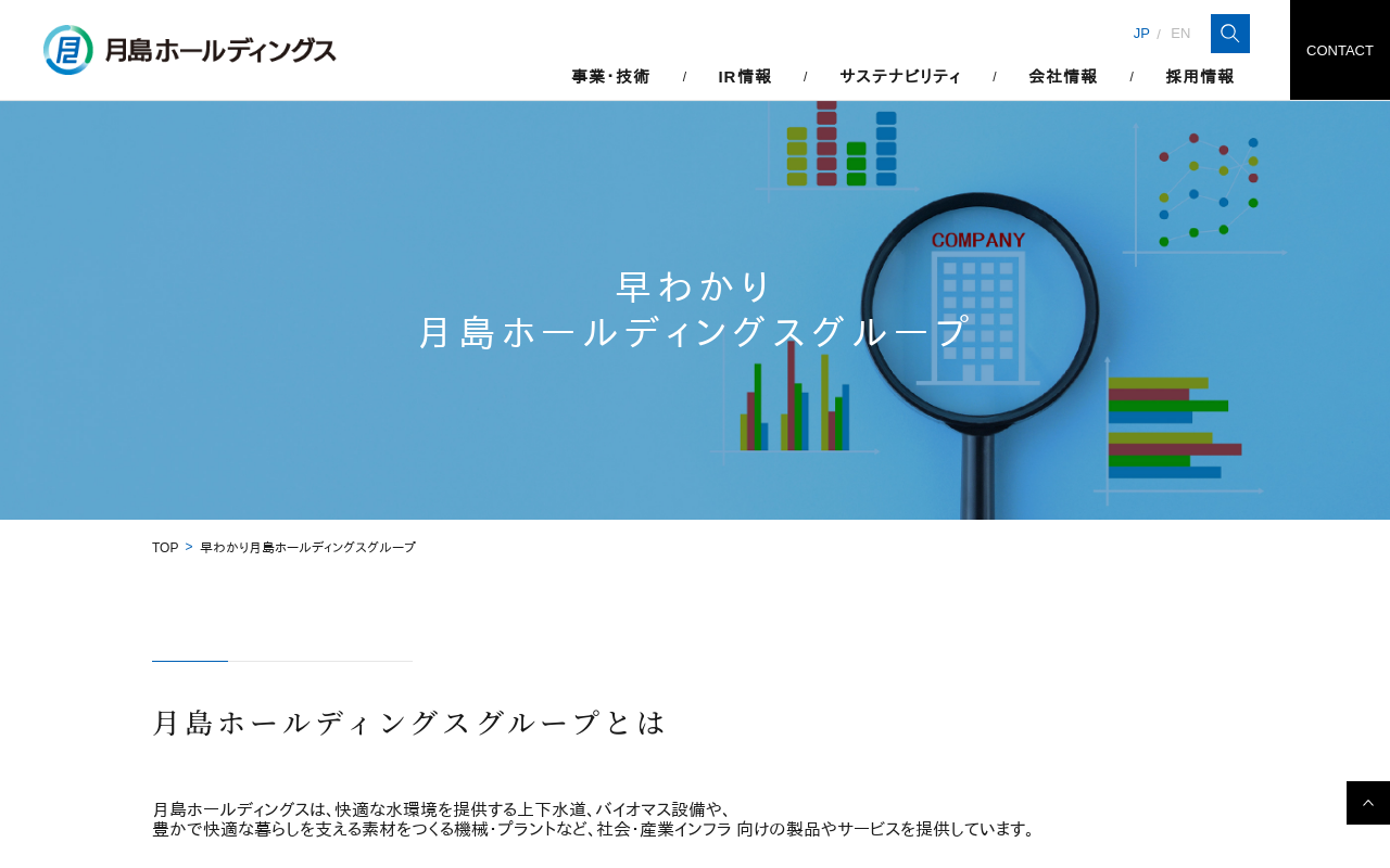 早わかり月島ホールディングスグループ|月島ホールディングス株式会社 早わかり月島ホールディングスグループ 早わかり月島ホールディングスグループ 月島ホールディングスグループとは 数字で見る月島ホールディングスグループ 水環境事業 産業事業 その他事業 財務ハイライト 当社グループのポジション 非財務ハイライト もう少し詳しく知る 主な事業会社 主な事業会社 月島ホールディングスは、快適な水環境を提供する上...(もっと見る)