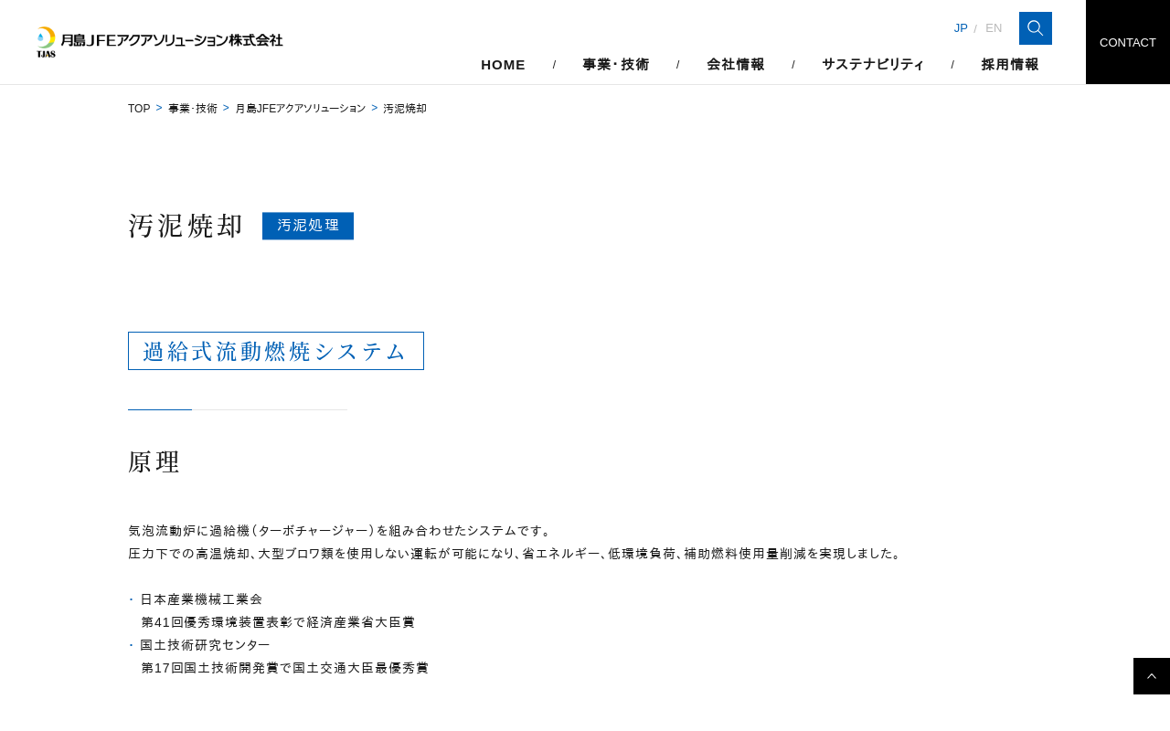 汚泥焼却|水環境事業|月島ホールディングス株式会社 過給式流動燃焼システム 汚泥焼却 原理 特長 原理 特長 温室効果ガス削減効果 関連分野/設備・技術 月島JFEアクアソリューション (機器・プラント)について 過給式流動燃焼システム 創エネルギー型脱水焼却システム 発電型汚泥焼却技術 OdySSEA(オデッセア) 上水処理設備 下水処理設備 汚泥再生 気泡流動炉に過給機(ターボチャージャ...(もっと見る)