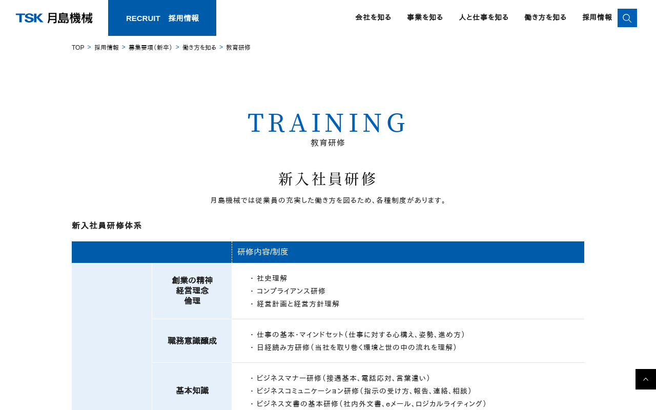 教育研修 | 月島ホールディングス株式会社 TRAINING 新入社員研修 共通教育 自己啓発 キャリア支援/フォローアップ コンプライアンス研修 日経読み方研修 ビジネスマナー研修 ビジネスコミュニケーション研修 ビジネス文書の基本研修 工場実習 キャリア面談 メンター制度 教育研修 月島ホールディングスグループでは従業員の充実した働き方を図るため、各種制度があります。 CSR(企業の社会的責任)・情報...(もっと見る)