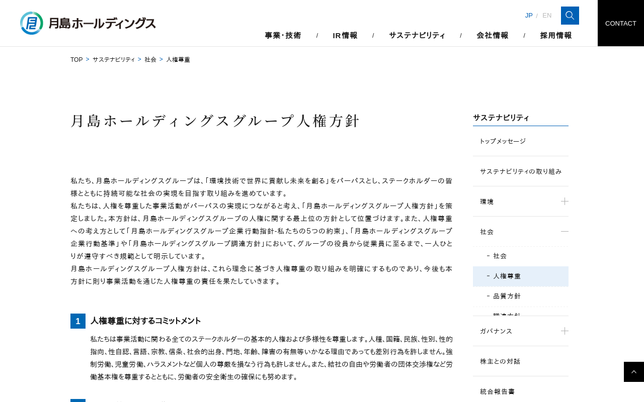 人権方針 | 社会 | サステナビリティ | 月島ホールディングス株式会社 月島ホールディングスグループ人権方針 サステナビリティ 私たち、月島ホールディングスグループは、「環境技術で世界に貢献し未来を創る」をパーパスとし、ステークホルダーの皆様とともに持続可能な社会の実現を目指す取り組みを進めています。 私たちは、人権を尊重した事業活動がパーパスの実現につながると考え、「月島ホールディングス...(もっと見る)