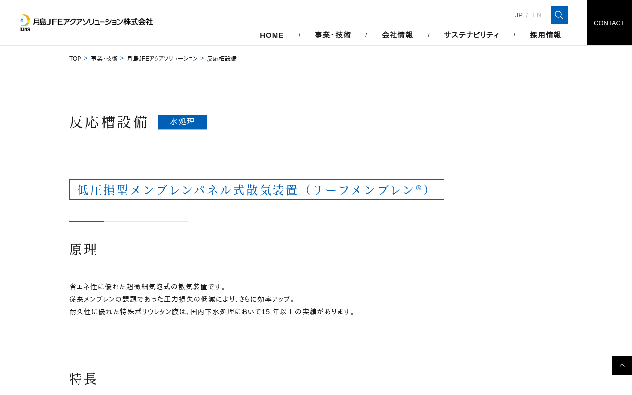 反応槽設備|水環境事業|月島ホールディングス株式会社 低圧損型メンブレンパネル式散気装置 反応槽設備 原理 特長 原理 特長 原理 特長 原理 実用例 関連分野/設備・技術 月島JFEアクアソリューション (機器・プラント)について 低圧損型メンブレンパネル式散気装置(リーフメンブレン®) 磁気浮上式高速電動機直結単段ターボブロワ スウィングミキサーNeo 担体投入型反応タンク設備(BioTub...(もっと見る)
